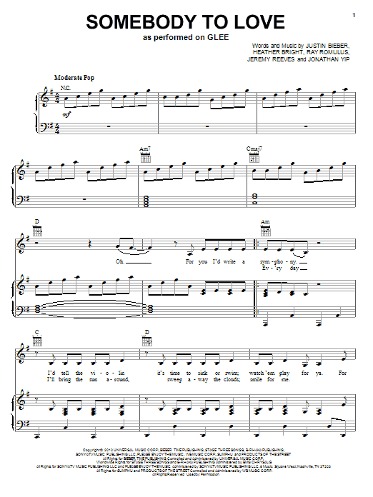 Download or print Glee Cast Somebody To Love sheet music, chords and digital score arranged for Piano, Vocal & Guitar Chords. This Pop score includes 6 page(s).