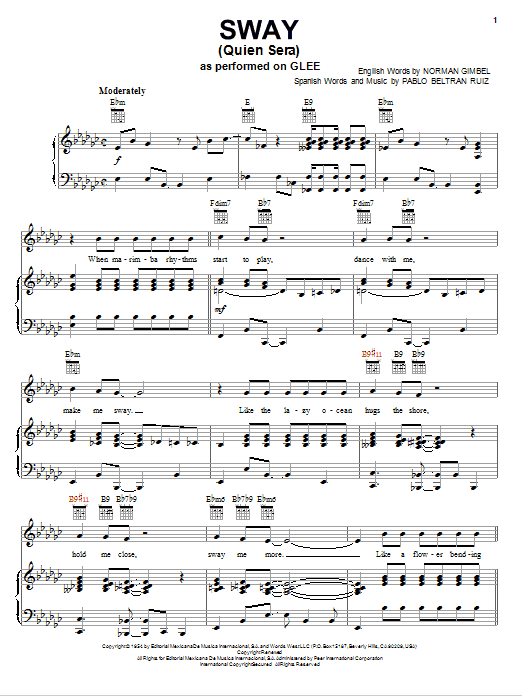 Download or print Glee Cast Sway (Quien Sera) sheet music, chords and digital score arranged for Piano, Vocal & Guitar Chords. This Film/TV score includes 4 page(s).