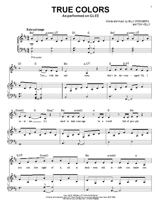 Download or print Glee Cast True Colors sheet music, chords and digital score arranged for Piano & Vocal. This Film/TV score includes 5 page(s).