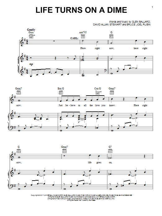 Download or print Glen Ballard Life Turns On A Dime sheet music, chords and digital score arranged for Piano, Vocal & Guitar Chords (Right-Hand Melody). This Musical/Show score includes 6 page(s).