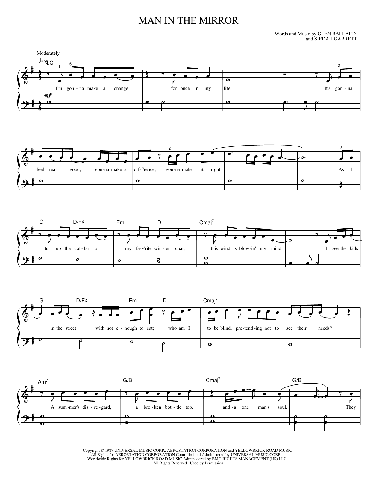 Download or print Glen Ballard Man in the Mirror sheet music, chords and digital score arranged for Piano, Vocal & Guitar Chords (Right-Hand Melody). This Pop score includes 3 page(s).