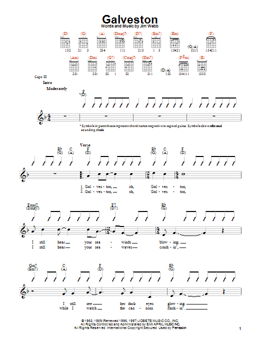 Download or print Glen Campbell Galveston sheet music, chords and digital score arranged for Lead Sheet / Fake Book. This Country score includes 1 page(s).