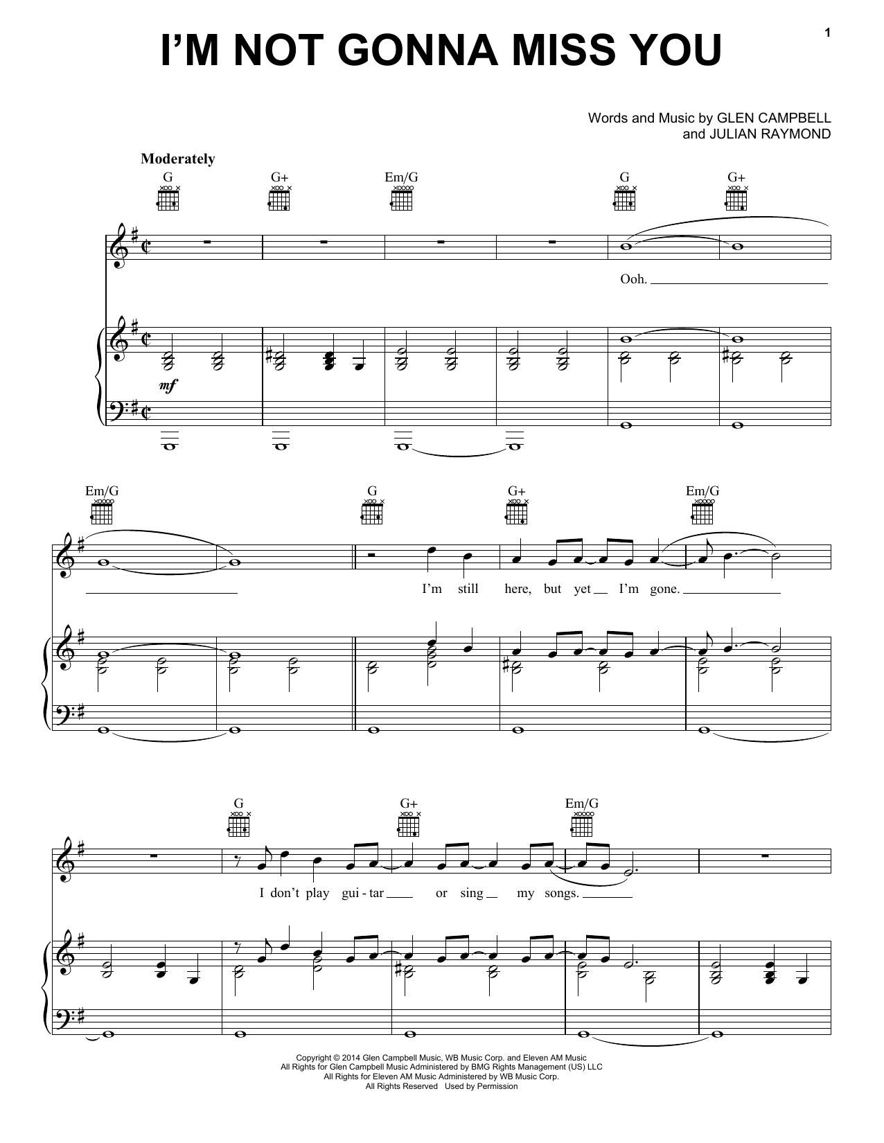 Download or print Glen Campbell I'm Not Gonna Miss You sheet music, chords and digital score arranged for Piano, Vocal & Guitar Chords (Right-Hand Melody). This Pop score includes 5 page(s).