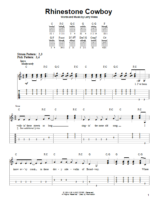 Download or print Glen Campbell Rhinestone Cowboy sheet music, chords and digital score arranged for Piano, Vocal & Guitar Chords (Right-Hand Melody). This Country score includes 4 page(s).