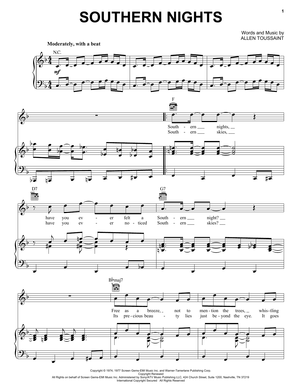 Download or print Glen Campbell Southern Nights sheet music, chords and digital score arranged for Easy Lead Sheet / Fake Book. This Country score includes 3 page(s).
