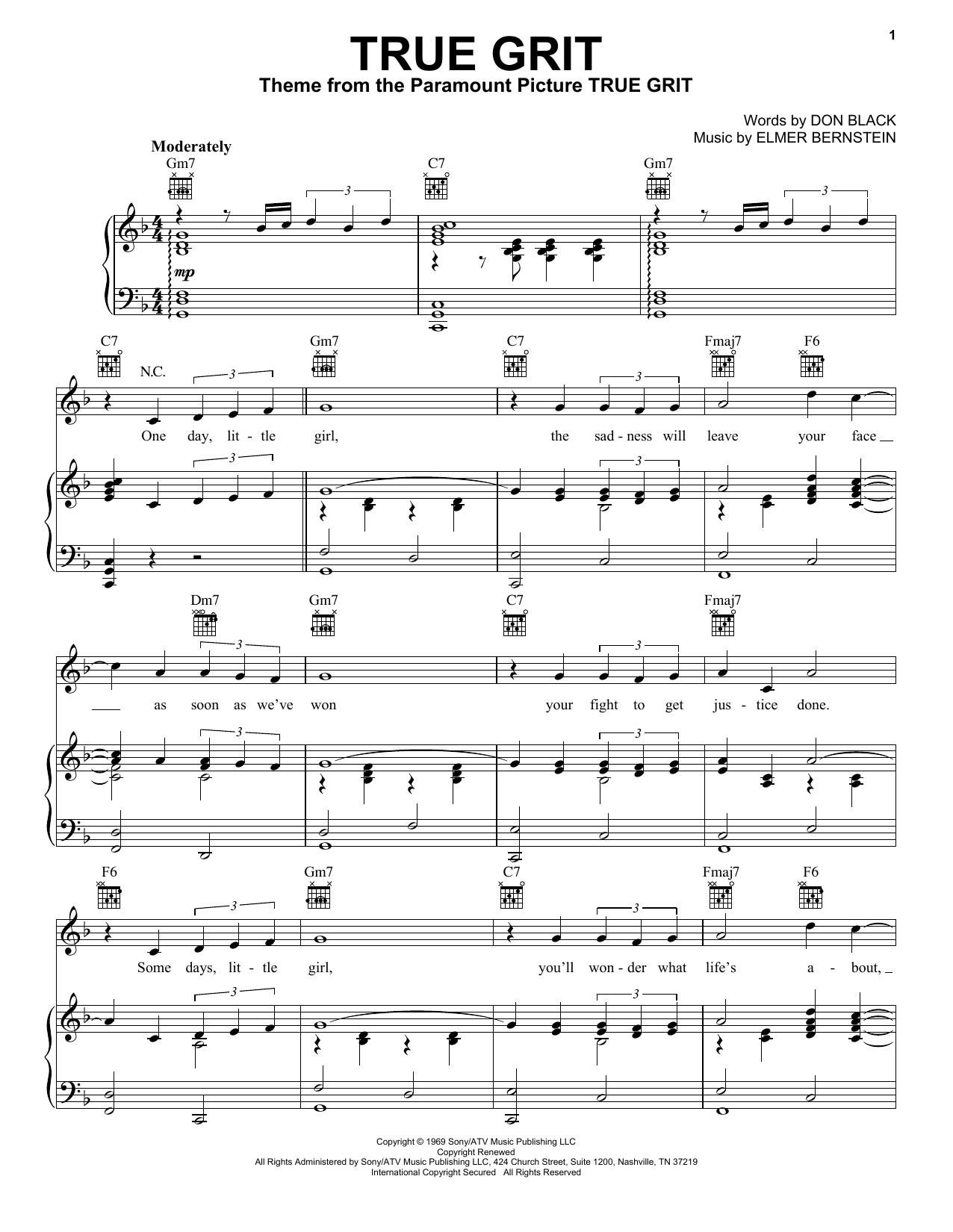 Download or print Glen Campbell True Grit sheet music, chords and digital score arranged for Piano, Vocal & Guitar Chords (Right-Hand Melody). This Country score includes 3 page(s).