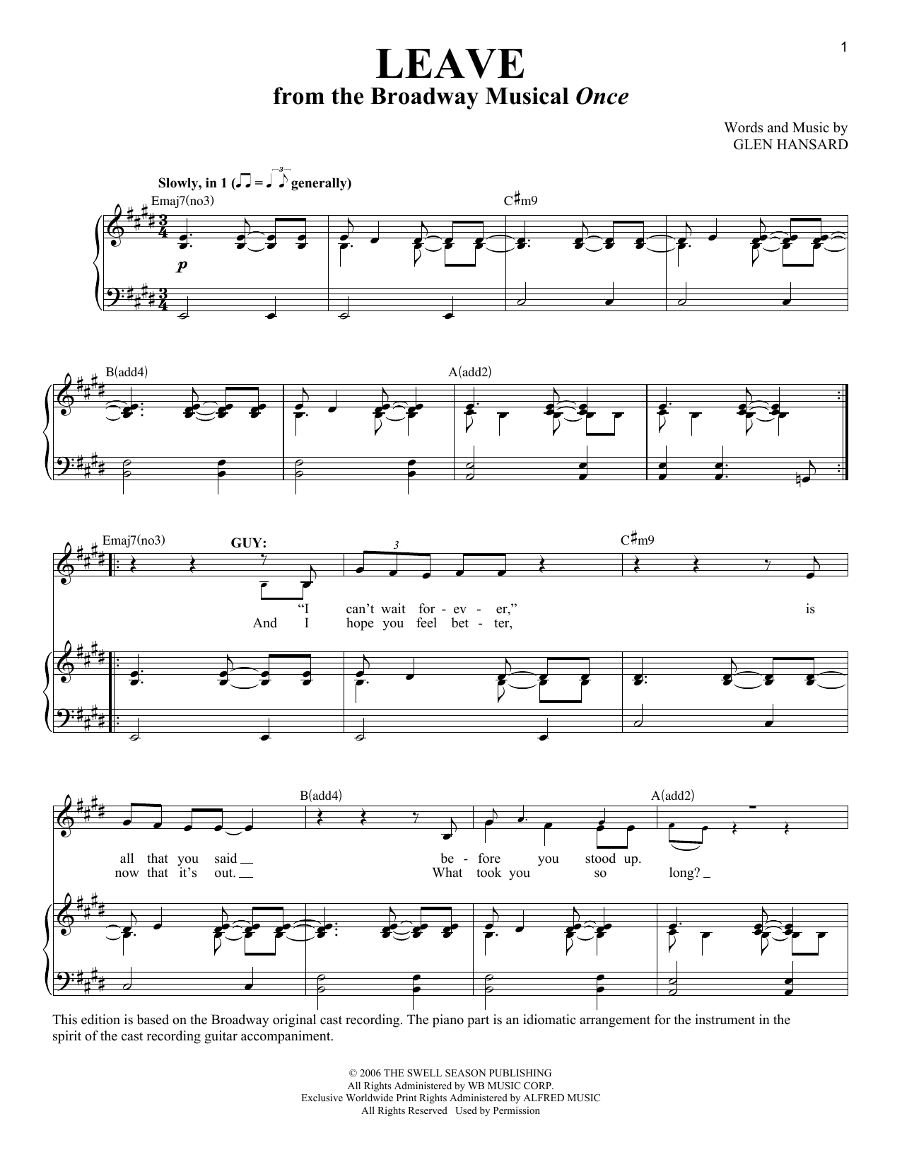 Download or print Glen Hansard Leave sheet music, chords and digital score arranged for Piano & Vocal. This Musical/Show score includes 6 page(s).