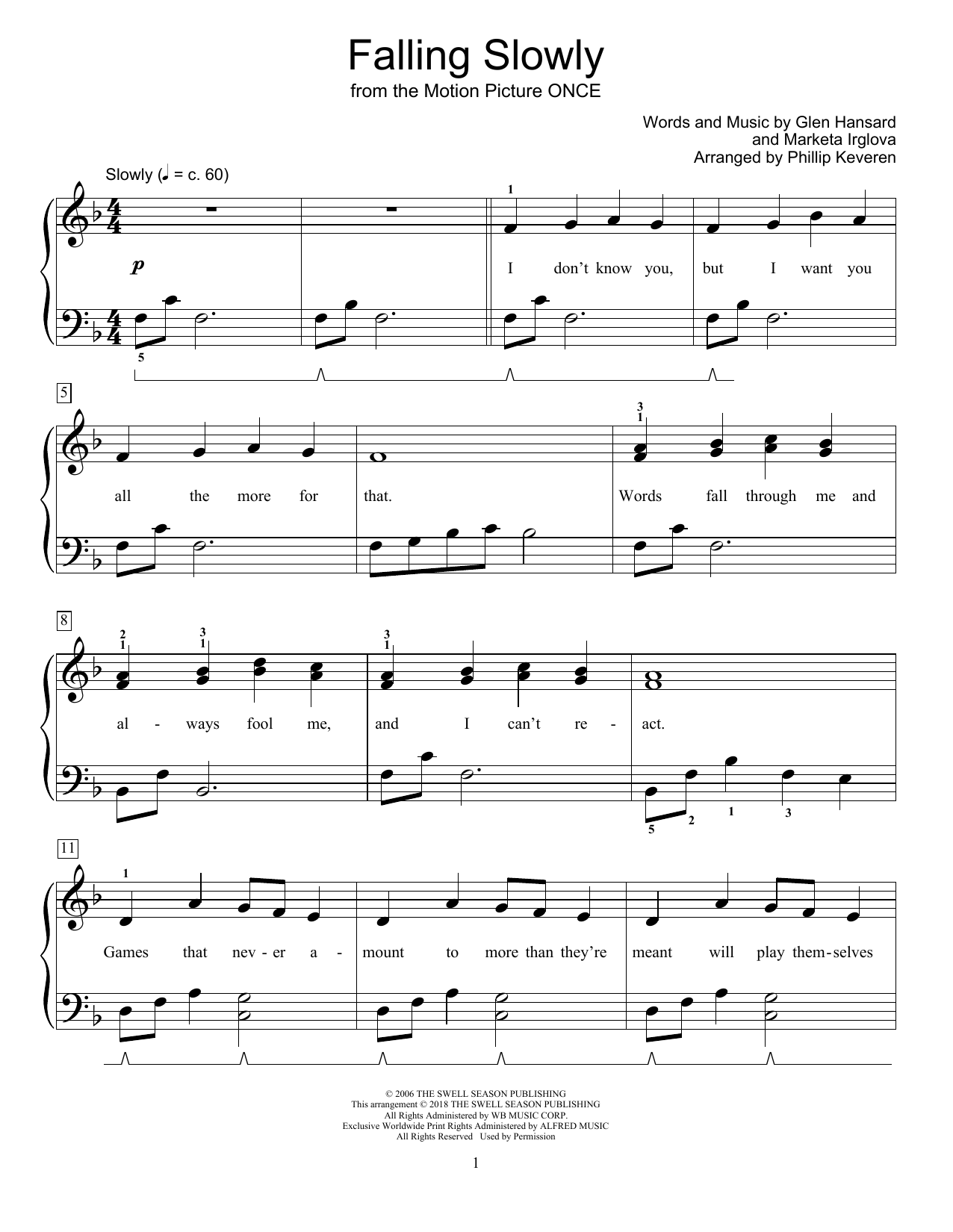 Download or print Glen Hansard & Marketa Irglova Falling Slowly (from Once) (arr. Phillip Keveren) sheet music, chords and digital score arranged for Educational Piano. This Pop score includes 4 page(s).