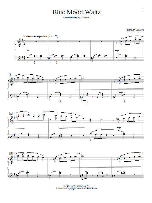 Download or print Glenda Austin Blue Mood Waltz sheet music, chords and digital score arranged for Educational Piano. This Pop score includes 3 page(s).