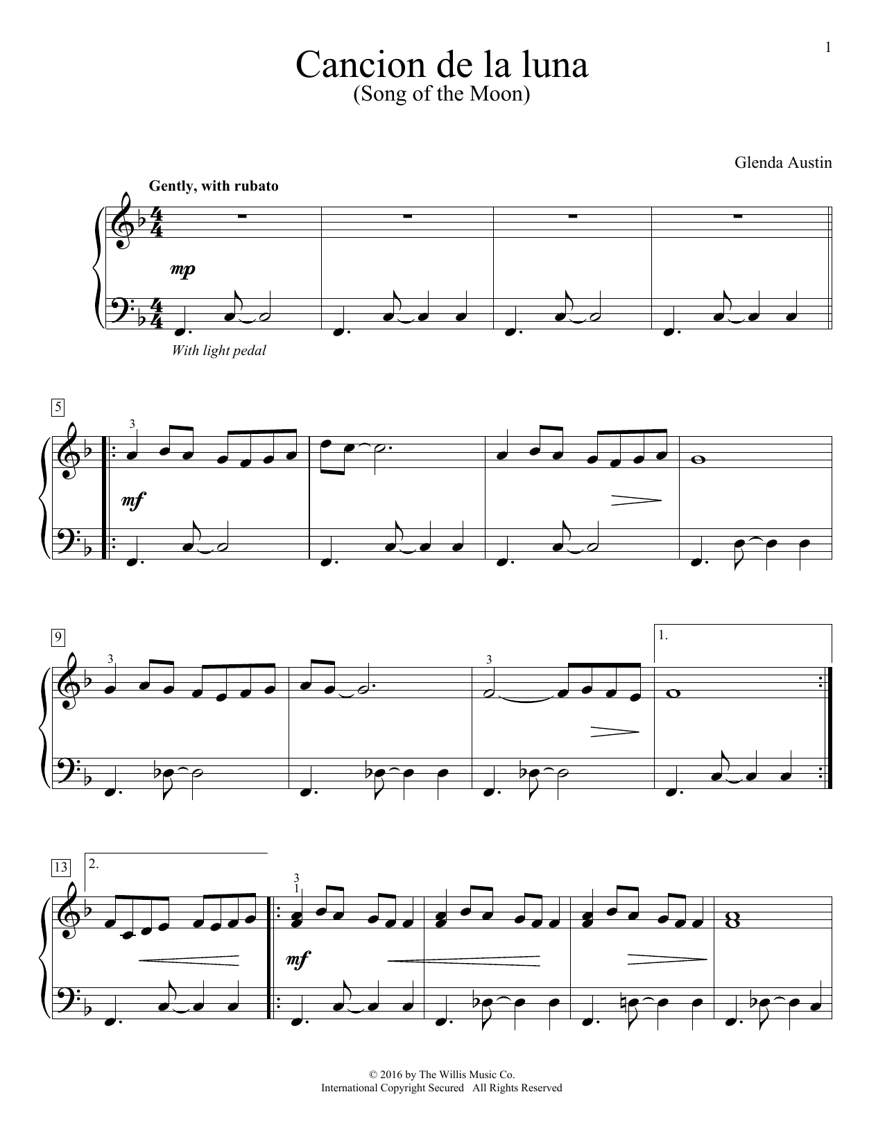 Download or print Glenda Austin Cancion De La Luna sheet music, chords and digital score arranged for Piano Solo. This Children score includes 2 page(s).