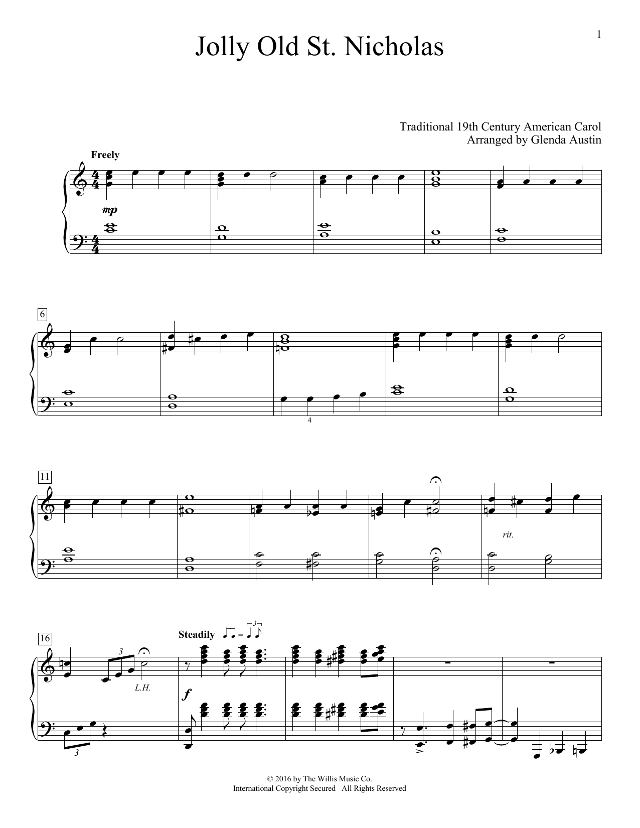 Download or print Glenda Austin Jolly Old St. Nicholas sheet music, chords and digital score arranged for Educational Piano. This Christmas score includes 2 page(s).