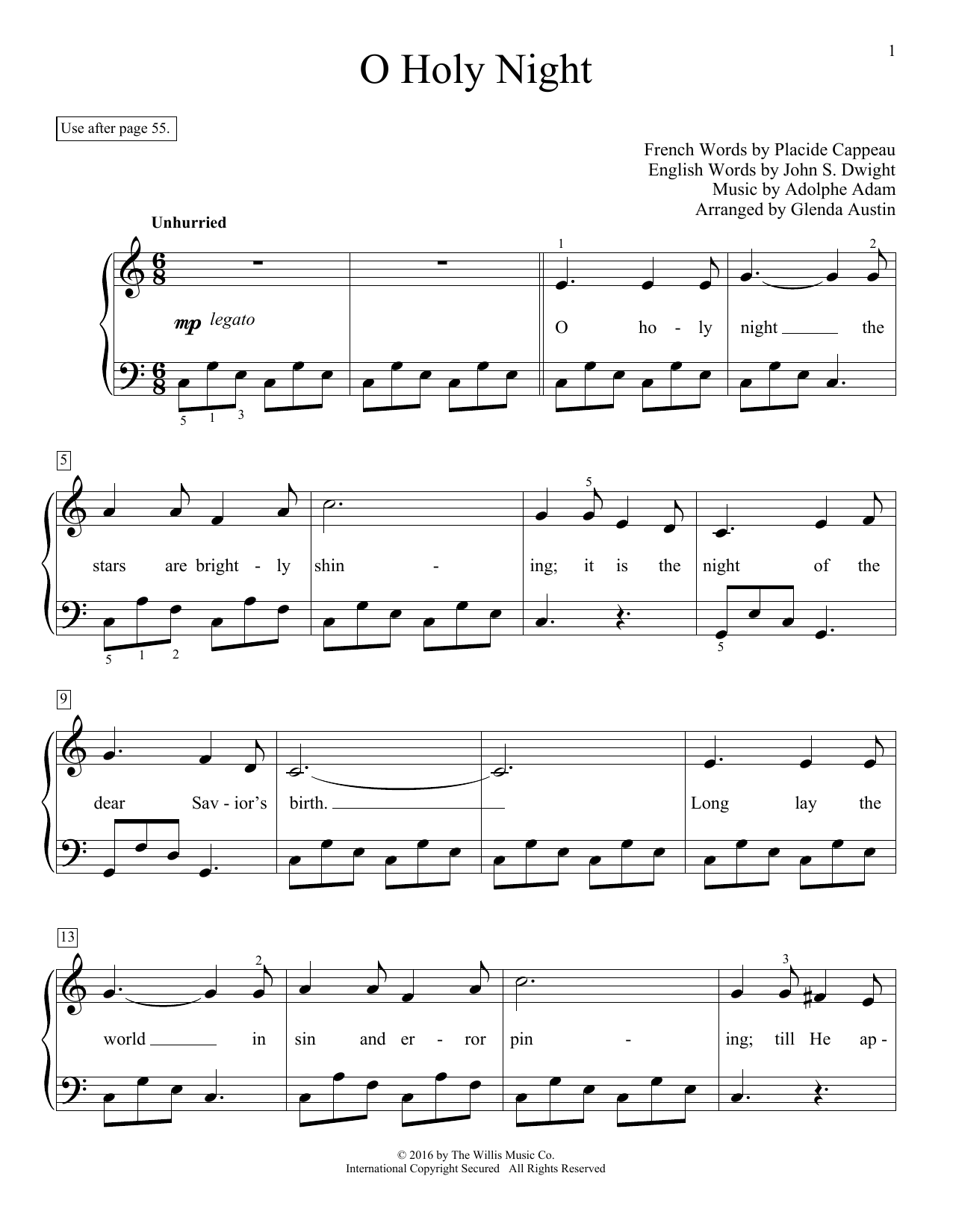 Download or print Glenda Austin O Holy Night sheet music, chords and digital score arranged for Educational Piano. This Christmas score includes 3 page(s).