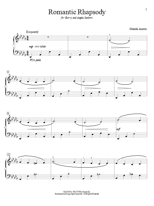 Download or print Glenda Austin Romantic Rhapsody sheet music, chords and digital score arranged for Educational Piano. This Jazz score includes 7 page(s).
