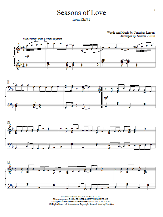 Download or print Glenda Austin Seasons Of Love (from Rent) sheet music, chords and digital score arranged for Educational Piano. This Film/TV score includes 3 page(s).