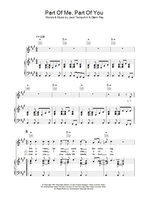 Download or print Glenn Frey Part Of Me, Part Of You sheet music, chords and digital score arranged for Piano, Vocal & Guitar Chords. This Pop score includes 6 page(s).
