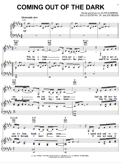 Download or print Gloria Estefan Coming Out Of The Dark sheet music, chords and digital score arranged for Piano, Vocal & Guitar Chords (Right-Hand Melody). This Inspirational score includes 6 page(s).