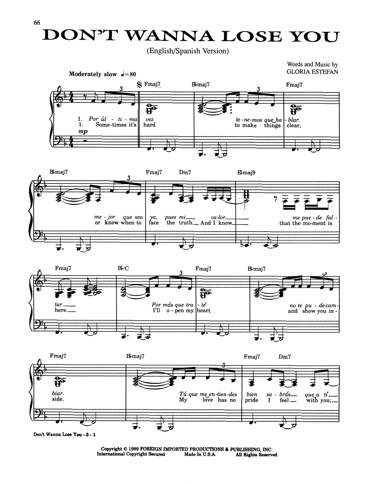Download or print Gloria Estefan Don't Wanna Lose You sheet music, chords and digital score arranged for Piano, Vocal & Guitar Chords (Right-Hand Melody). This Pop score includes 3 page(s).