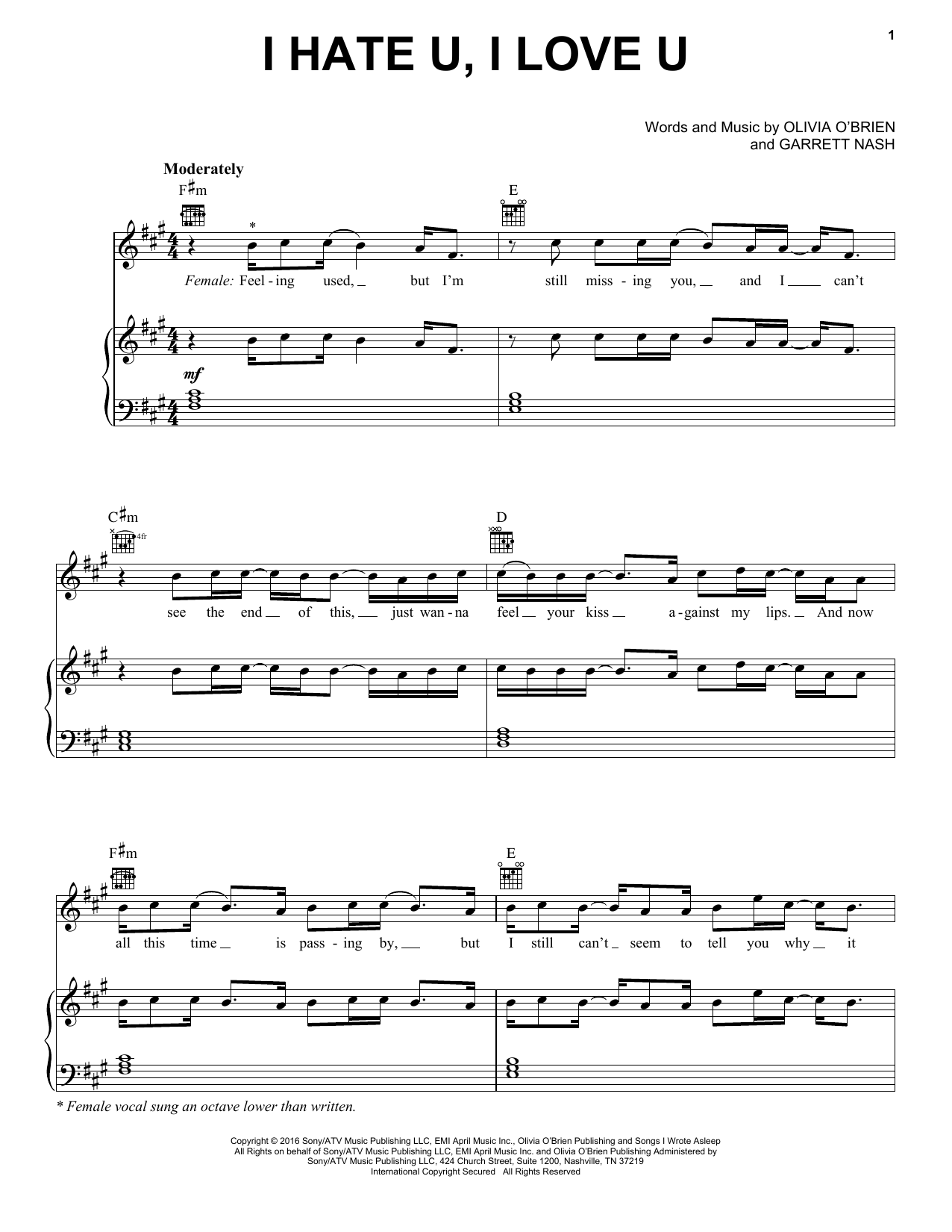 Download or print Gnash I Hate U, I Love U sheet music, chords and digital score arranged for Piano, Vocal & Guitar Chords (Right-Hand Melody). This Pop score includes 10 page(s).