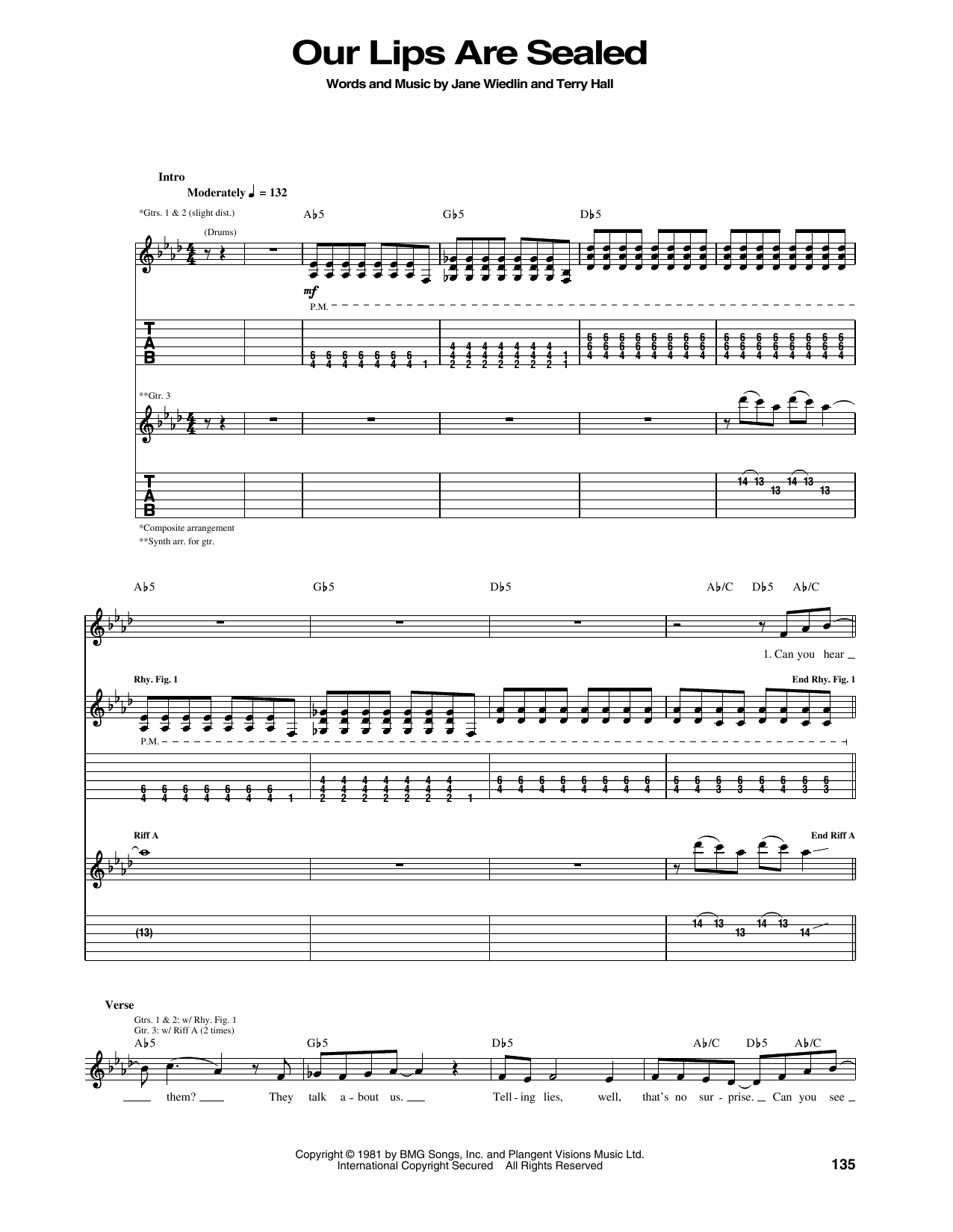 Download or print Go-Go'S Our Lips Are Sealed sheet music, chords and digital score arranged for Guitar Tab. This Pop score includes 5 page(s).