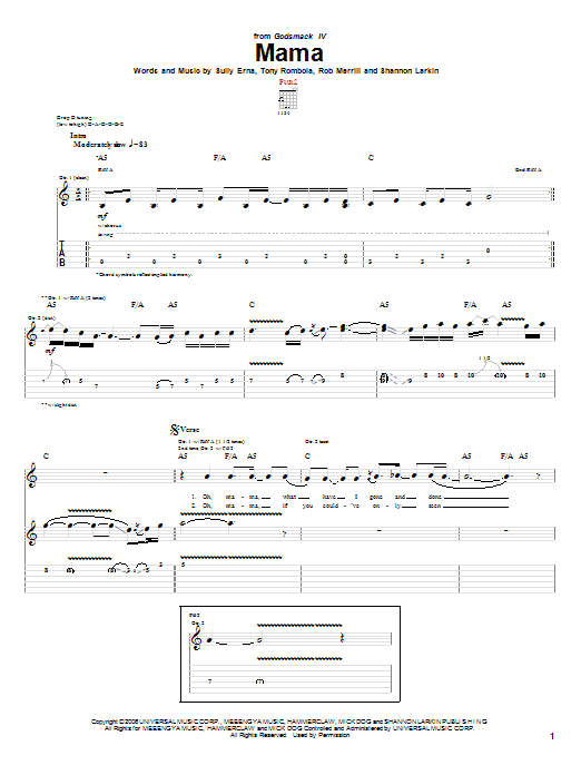 Download or print Godsmack Mama sheet music, chords and digital score arranged for Guitar Tab. This Metal score includes 9 page(s).