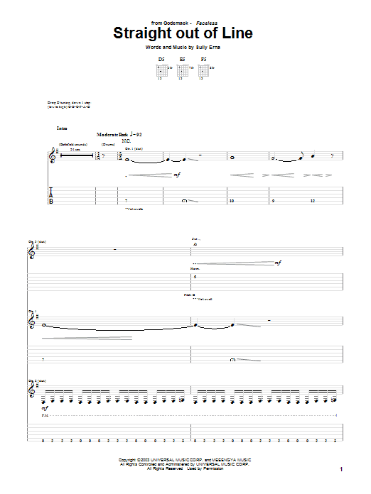 Download or print Godsmack Straight Out Of Line sheet music, chords and digital score arranged for Guitar Tab. This Metal score includes 9 page(s).