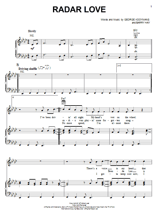 Download or print Golden Earring Radar Love sheet music, chords and digital score arranged for Piano, Vocal & Guitar Chords (Right-Hand Melody). This Metal score includes 8 page(s).