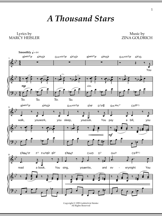 Download or print Goldrich & Heisler A Thousand Stars sheet music, chords and digital score arranged for Piano & Vocal. This Broadway score includes 4 page(s).