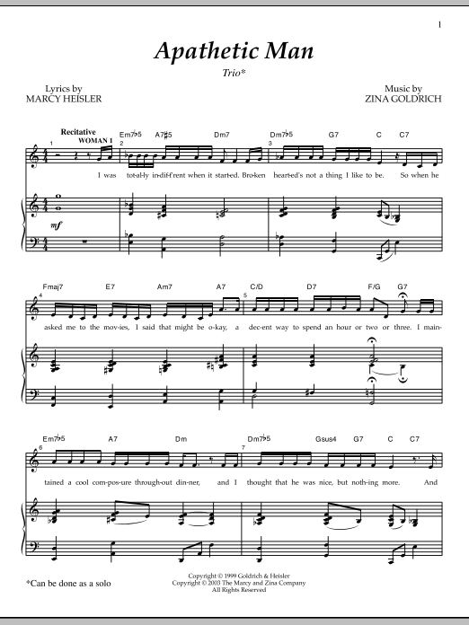 Download or print Goldrich & Heisler Apathetic Man sheet music, chords and digital score arranged for Piano & Vocal. This Broadway score includes 8 page(s).