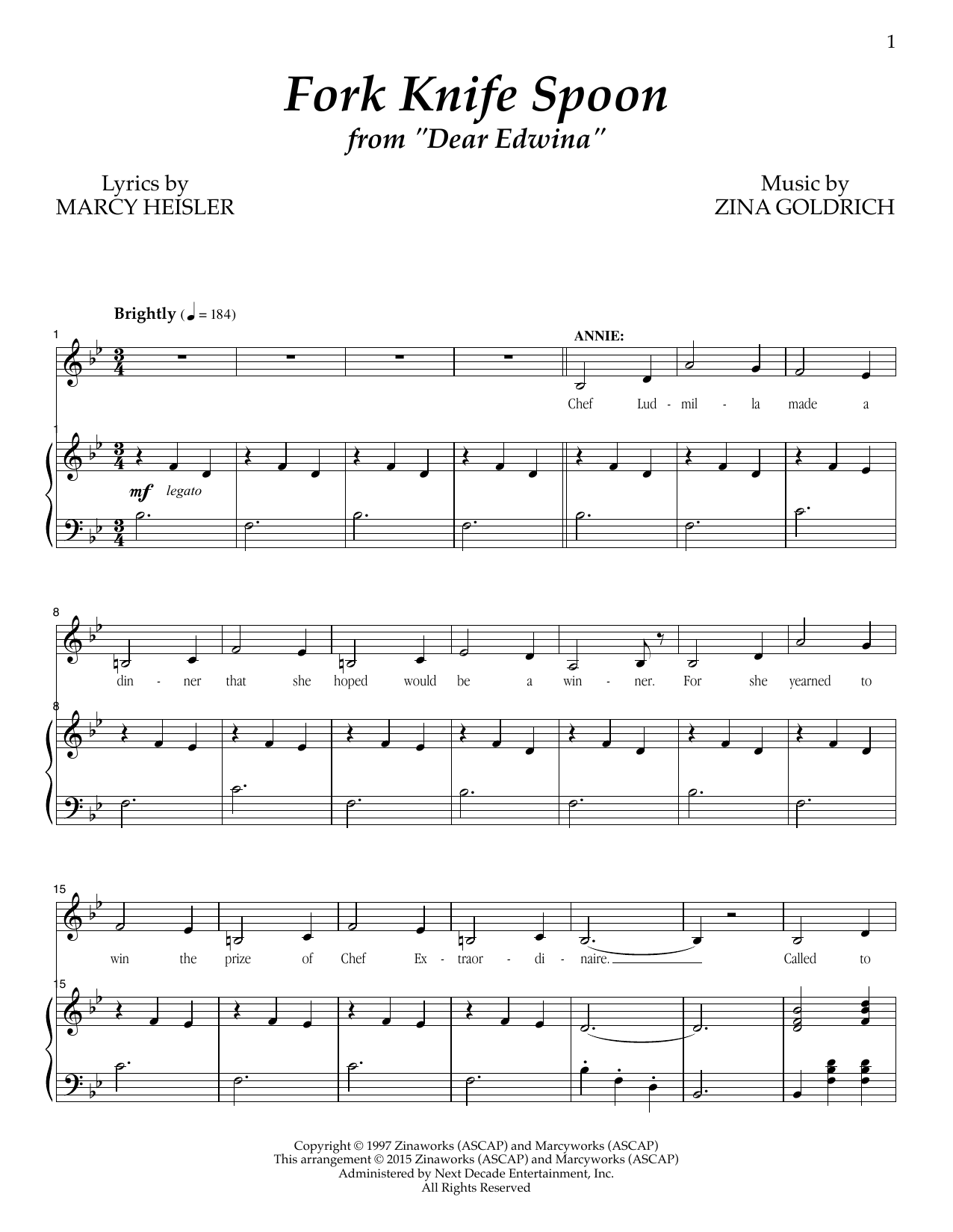 Download or print Goldrich & Heisler Fork Knife Spoon sheet music, chords and digital score arranged for Piano & Vocal. This Musical/Show score includes 14 page(s).