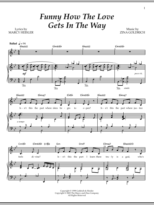 Download or print Goldrich & Heisler Funny How The Love Gets In The Way sheet music, chords and digital score arranged for Piano & Vocal. This Broadway score includes 6 page(s).