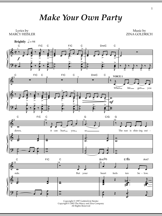 Download or print Goldrich & Heisler Make Your Own Party sheet music, chords and digital score arranged for Piano & Vocal. This Broadway score includes 8 page(s).