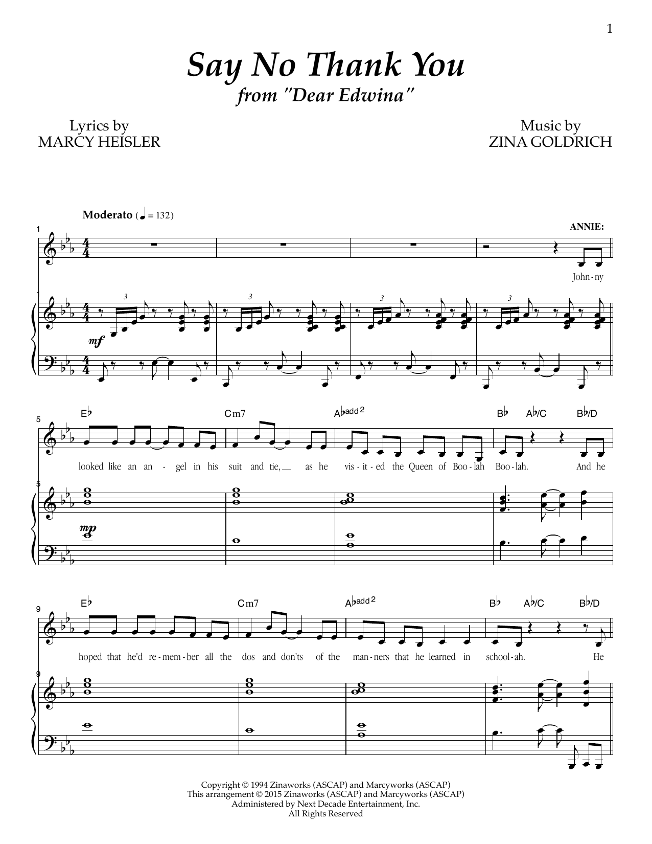 Download or print Goldrich & Heisler Say No Thank You sheet music, chords and digital score arranged for Piano & Vocal. This Musical/Show score includes 11 page(s).