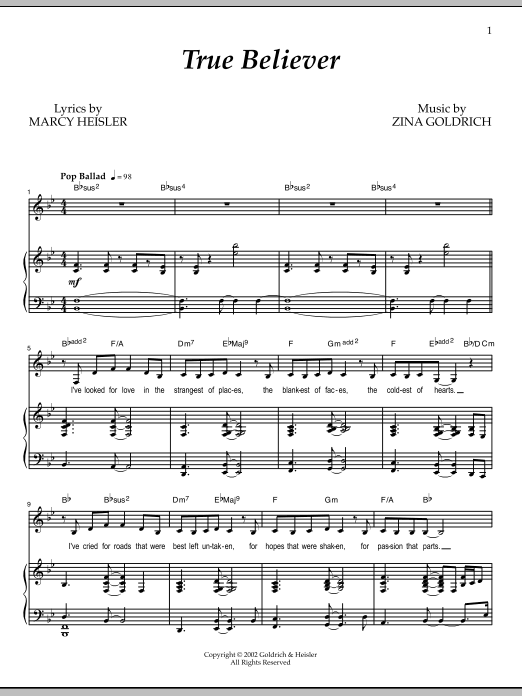 Download or print Goldrich & Heisler True Believer sheet music, chords and digital score arranged for Piano & Vocal. This Broadway score includes 6 page(s).