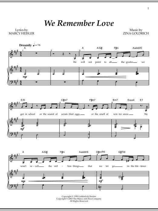 Download or print Goldrich & Heisler We Remember Love sheet music, chords and digital score arranged for Piano & Vocal. This Broadway score includes 6 page(s).