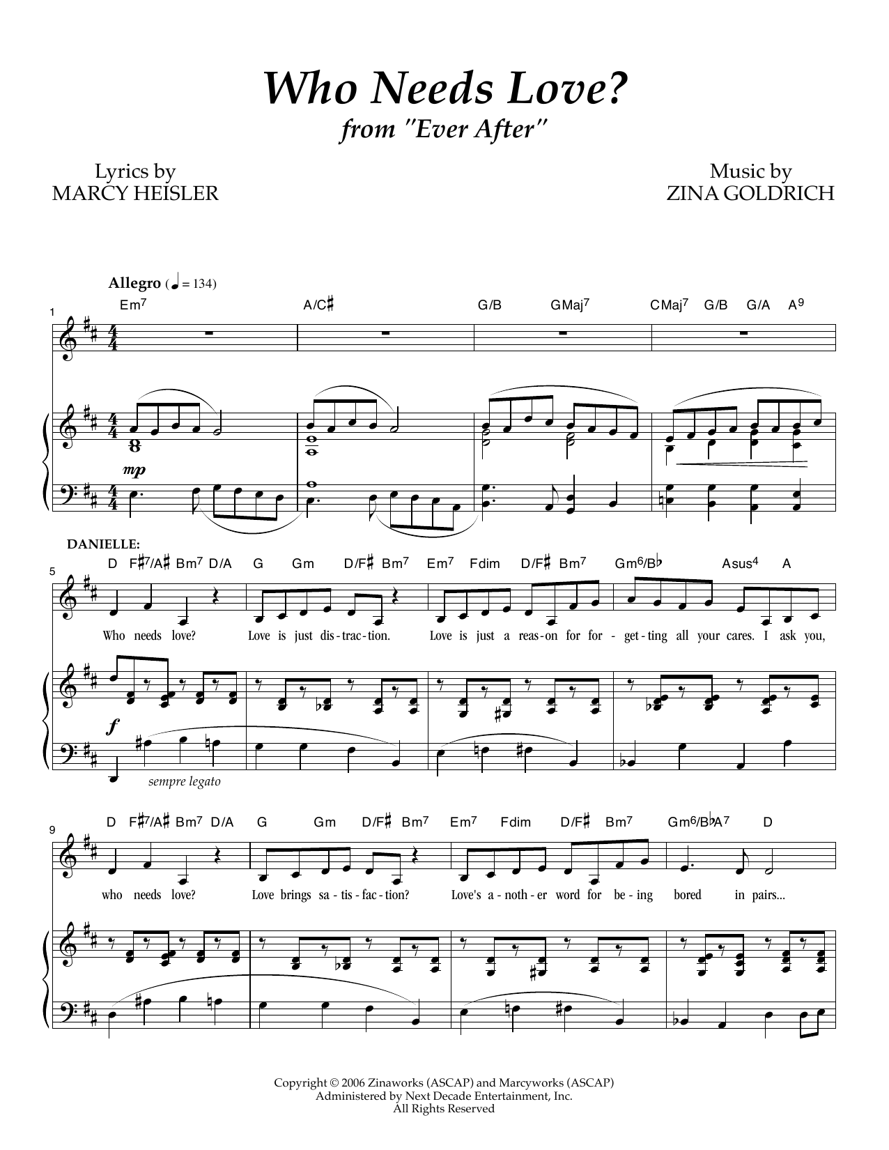 Download or print Goldrich & Heisler Who Needs Love? sheet music, chords and digital score arranged for Piano & Vocal. This Musical/Show score includes 8 page(s).