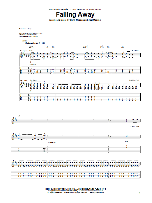 Download or print Good Charlotte Falling Away sheet music, chords and digital score arranged for Guitar Tab. This Metal score includes 5 page(s).