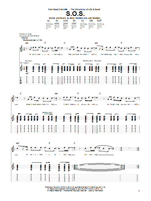 Download or print Good Charlotte S.O.S. sheet music, chords and digital score arranged for Guitar Tab. This Metal score includes 10 page(s).
