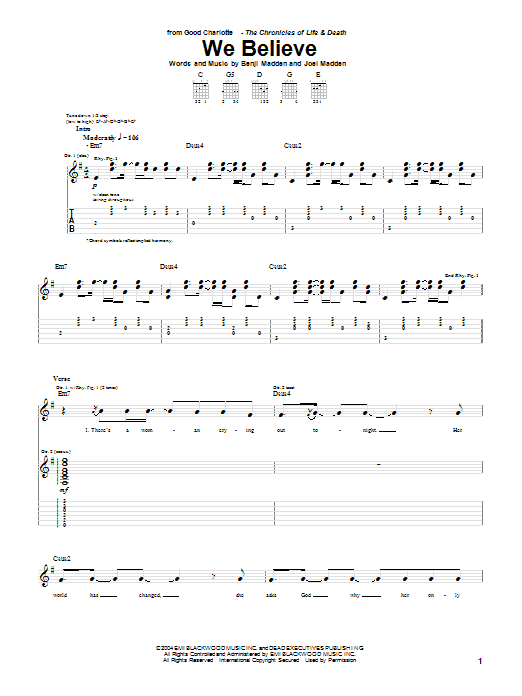 Download or print Good Charlotte We Believe sheet music, chords and digital score arranged for Guitar Tab. This Metal score includes 10 page(s).