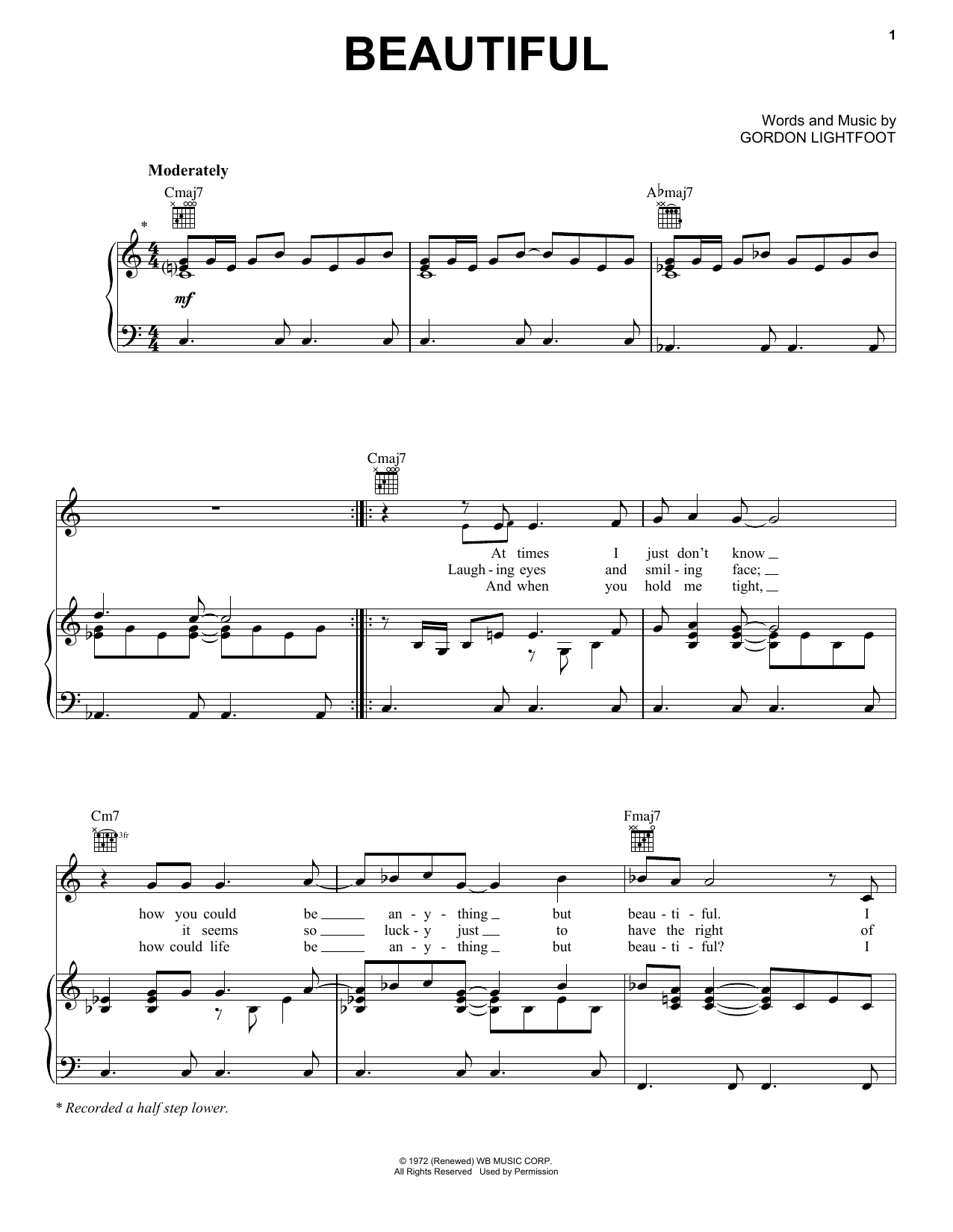 Download or print Gordon Lightfoot Beautiful sheet music, chords and digital score arranged for Piano, Vocal & Guitar Chords (Right-Hand Melody). This Folk score includes 4 page(s).