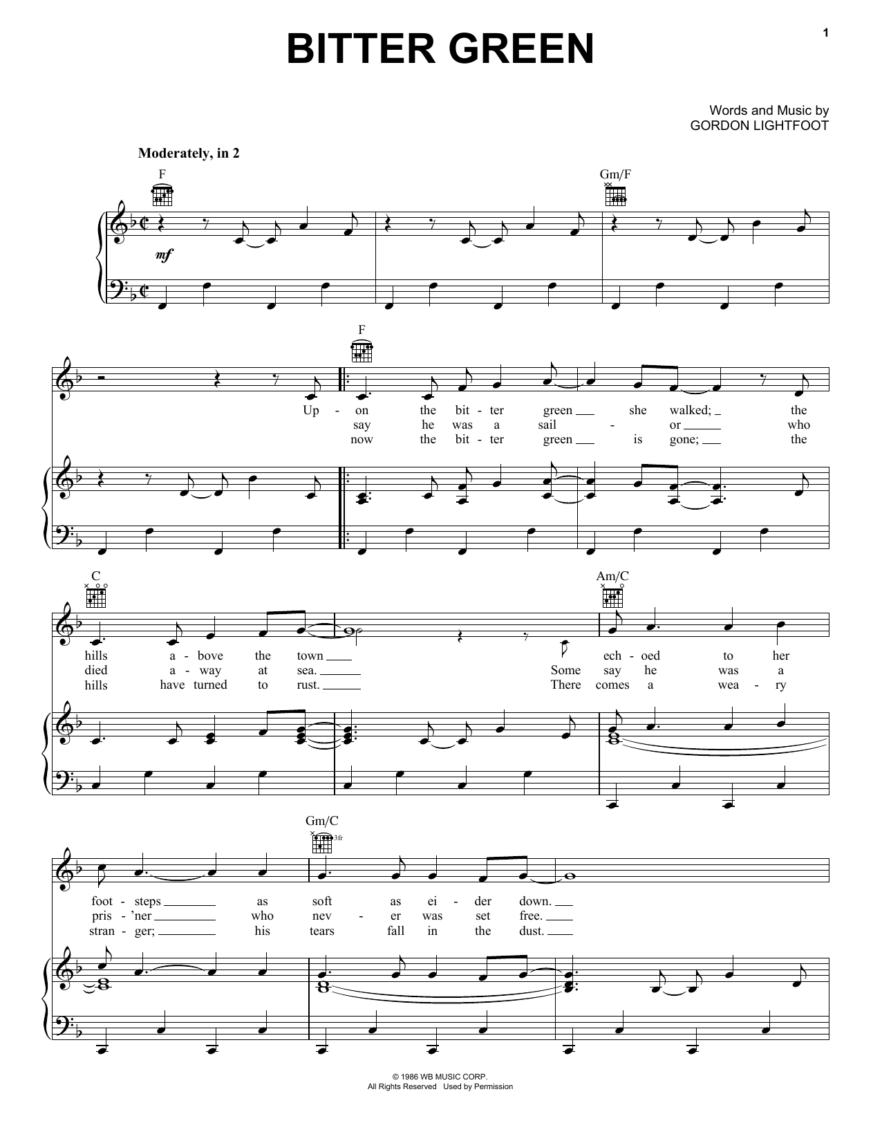 Download or print Gordon Lightfoot Bitter Green sheet music, chords and digital score arranged for Piano, Vocal & Guitar Chords (Right-Hand Melody). This Folk score includes 3 page(s).