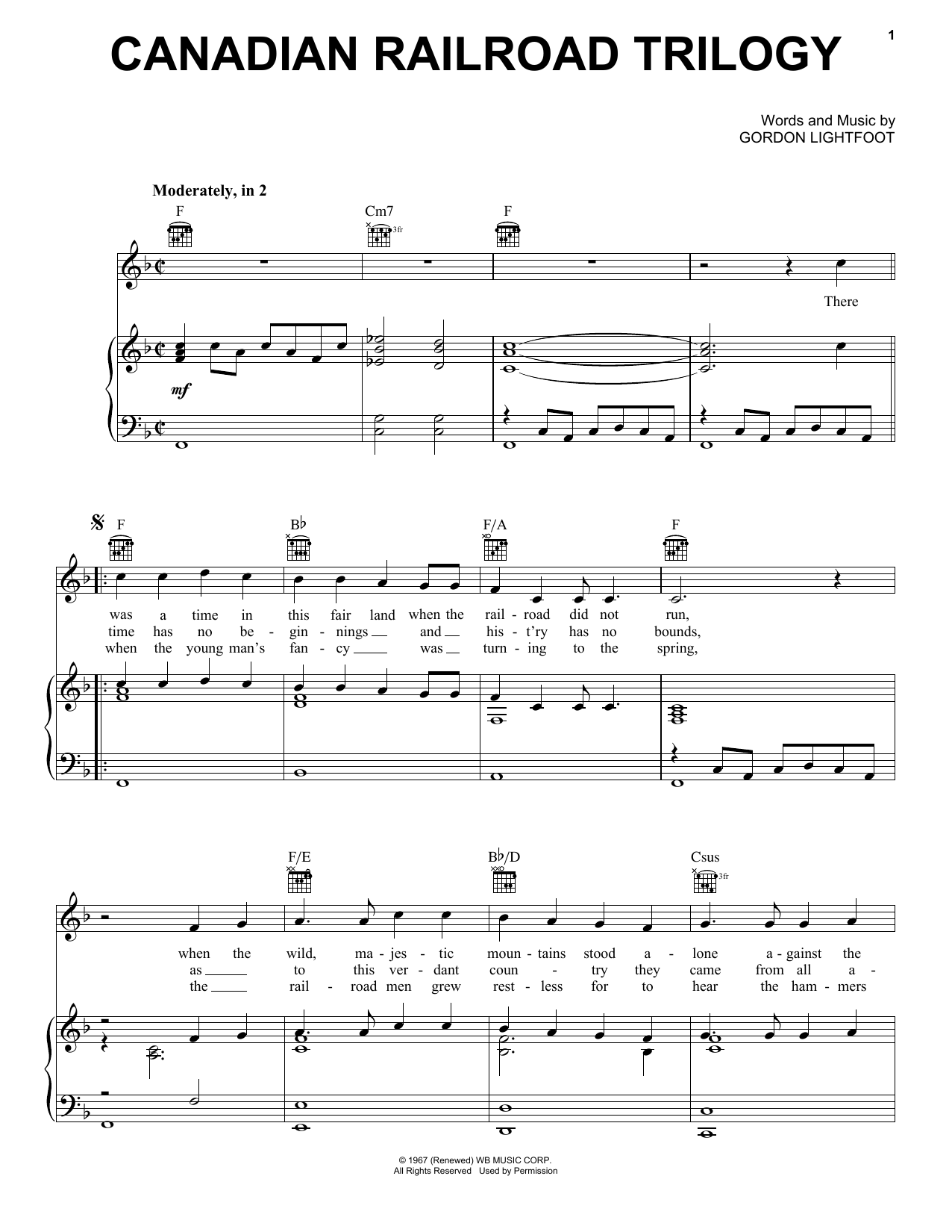 Download or print Gordon Lightfoot Canadian Railroad Trilogy sheet music, chords and digital score arranged for Piano, Vocal & Guitar Chords (Right-Hand Melody). This Folk score includes 8 page(s).