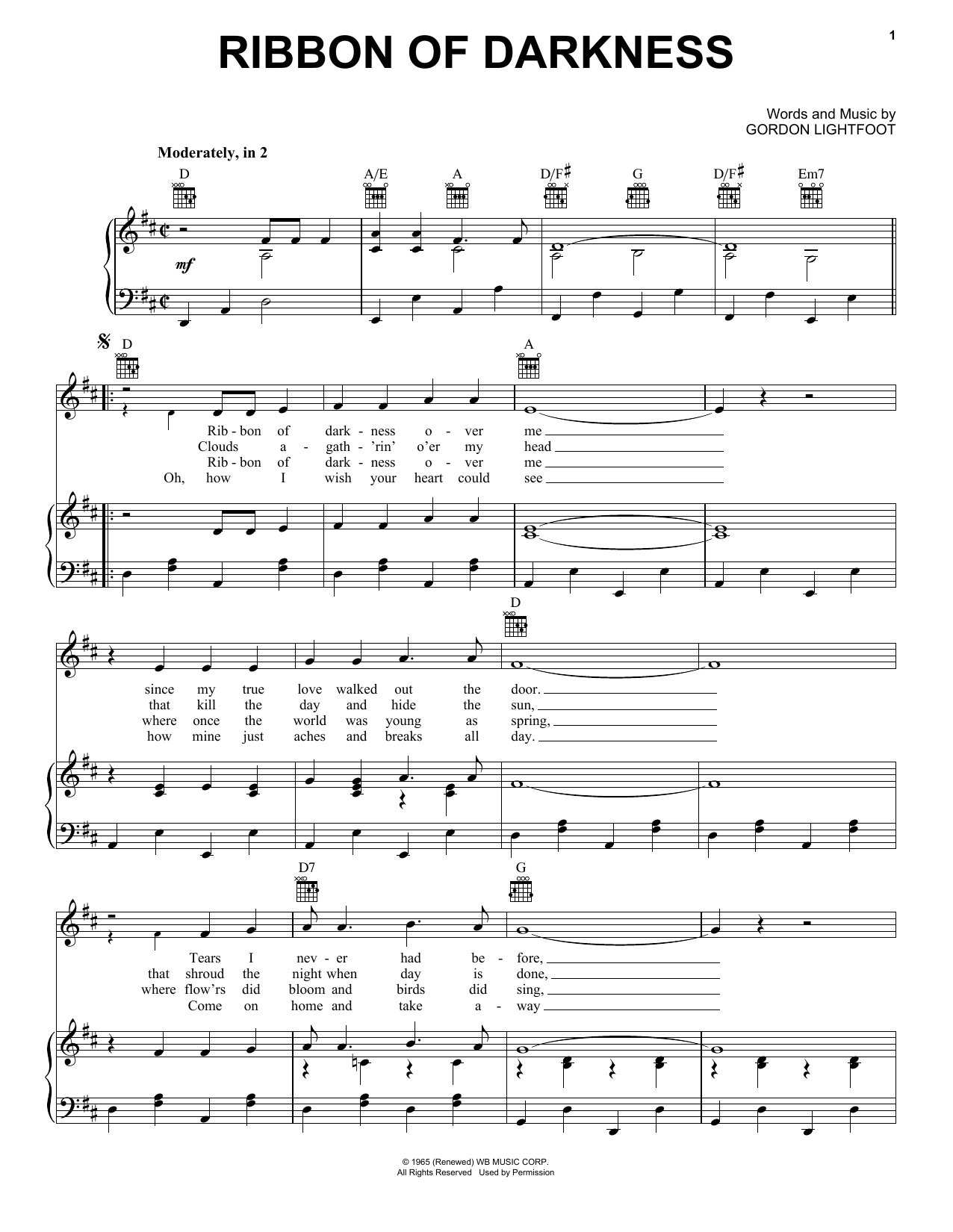 Download or print Gordon Lightfoot Ribbon Of Darkness sheet music, chords and digital score arranged for Piano, Vocal & Guitar Chords (Right-Hand Melody). This Folk score includes 3 page(s).