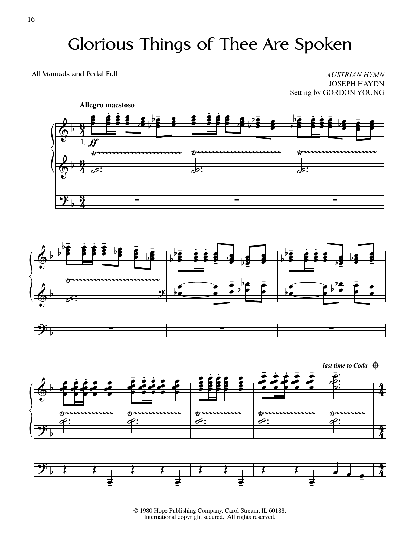 Download or print Gordon Young Glorious Things of Thee Are Spoken sheet music, chords and digital score arranged for Organ. This Hymn score includes 2 page(s).