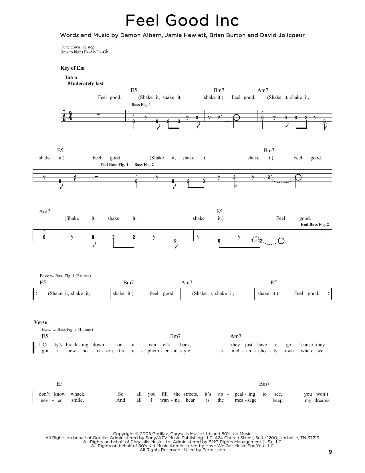 Download or print Gorillaz feat. De La Soul Feel Good Inc sheet music, chords and digital score arranged for Easy Bass Tab. This Hip-Hop score includes 3 page(s).