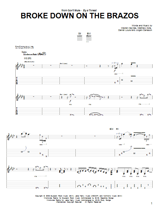 Download or print Gov't Mule Broke Down On The Brazos sheet music, chords and digital score arranged for Guitar Tab. This Country score includes 15 page(s).