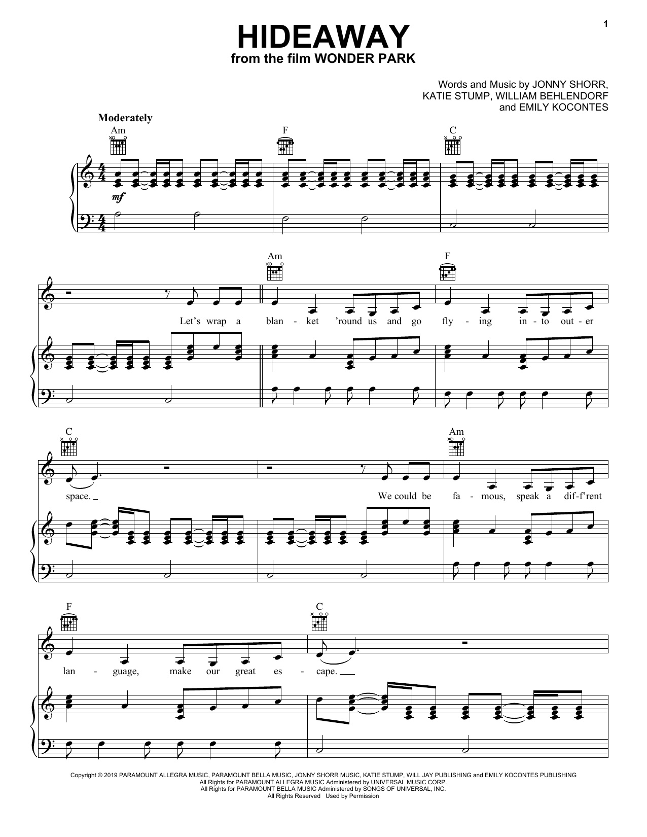 Download or print Grace VanderWaal Hideaway (from Wonder Park) sheet music, chords and digital score arranged for Easy Piano. This Film/TV score includes 5 page(s).