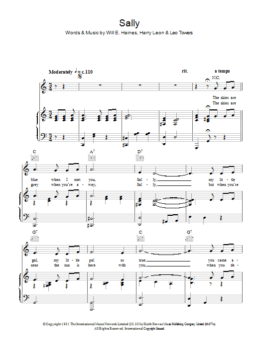 Download or print Gracie Fields Sally sheet music, chords and digital score arranged for Piano, Vocal & Guitar Chords. This Standards score includes 4 page(s).