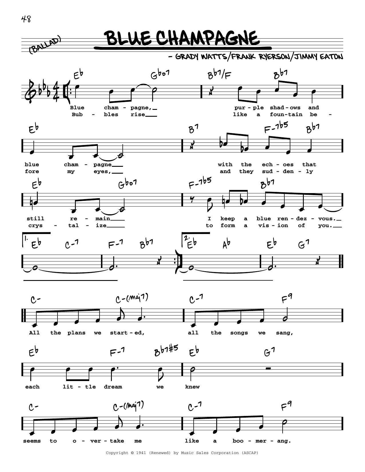 Download or print Grady Watts Blue Champagne (High Voice) sheet music, chords and digital score arranged for Real Book – Melody, Lyrics & Chords. This Jazz score includes 2 page(s).