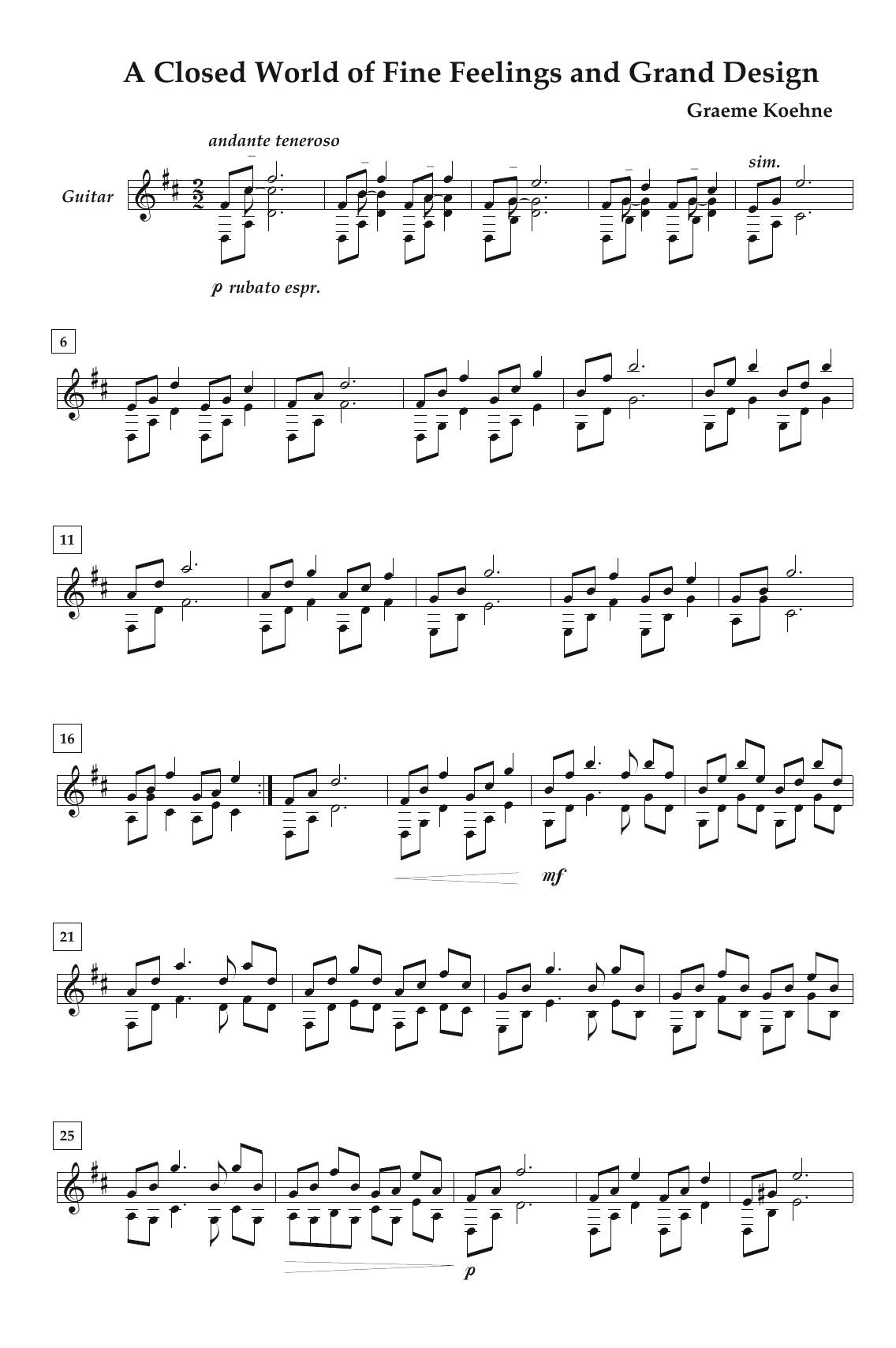 Download or print Graeme Koehne A Closed World Of Fine Feelings And Grand Design sheet music, chords and digital score arranged for Solo Guitar. This Classical score includes 5 page(s).