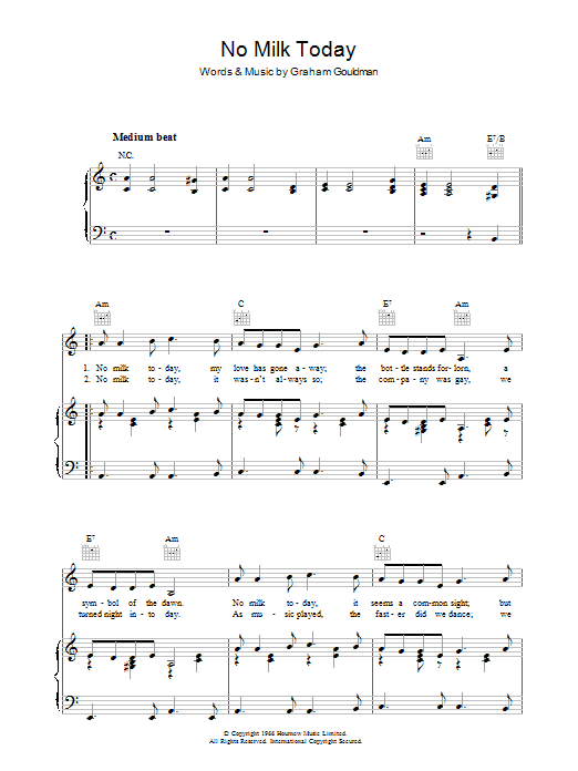 Download or print Graham Gouldman No Milk Today sheet music, chords and digital score arranged for Piano, Vocal & Guitar Chords. This Pop score includes 4 page(s).